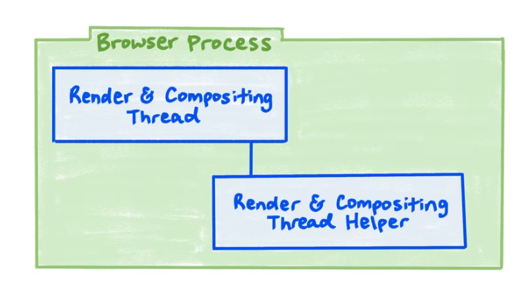 브라우저 프로세스 렌더링 및 컴포지팅 스레드는 메인 스레드와 컴포지터 스레드가 하나로 결합되는 것을 제외하고는 렌더 프로세스의 코드 및 기능과 유사하다. 설계에 의한 스레드가 없기 때문에 긴 메인 스레드 작업으로부터 성능을 분리할 필요가 없기 때문에 이 경우에는 스레드가 하나만 필요하다.