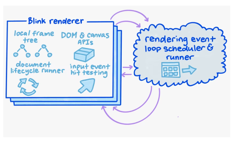 - 렌더링 이벤트 루프 스케줄러 및 runner는 이벤트 루프에서 실행할 항목과 시기를 결정한다. 장치 디스플레이와 일치하는 시점에서 렌더링이 발생하도록 예약합니다.